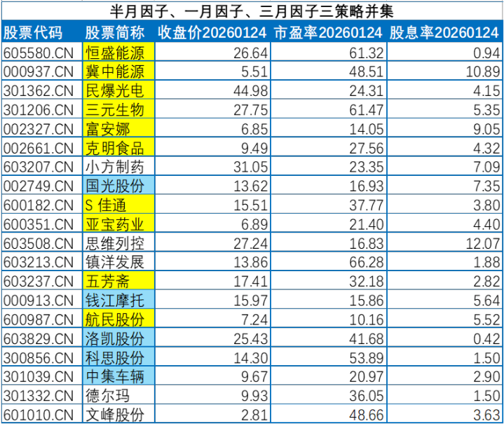 第九期(20260124-20260207),三个测试策略得到的组合交集如下表所示,总共是15只股票,平均股息率4.60,平均市盈率为32.54。
