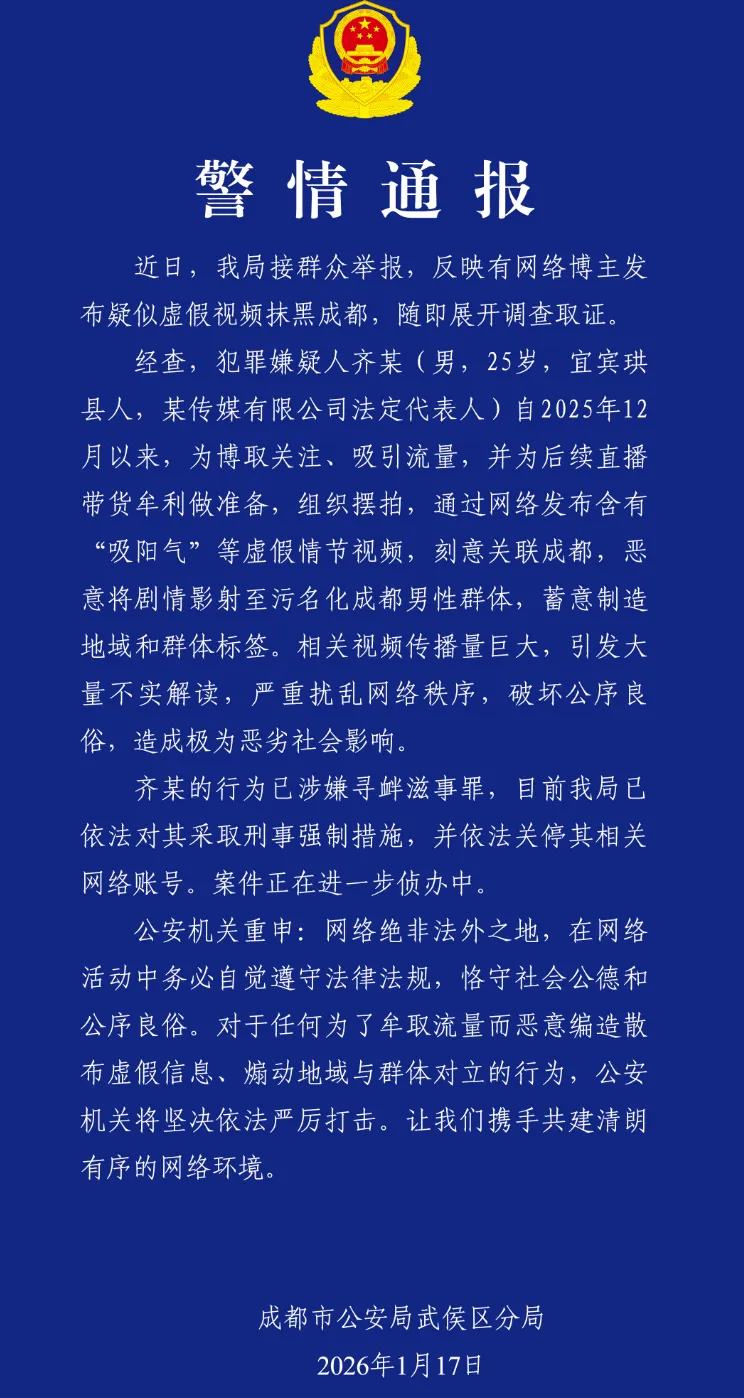 1月16日至19日,成都警方接连发布四则警情通报,展开了一场针对编造剧本、摆拍演绎、恶意关联等碰瓷营销抹黑成都城市形象的专项行动。这一组密集的警情通报,像一把利剑斩向“网络流量黑产”,不仅展现了维护城市声誉和网络秩序的决心,也为各地网络舆论环境治理“打好了样”。细读这几则通报,颇有深意。